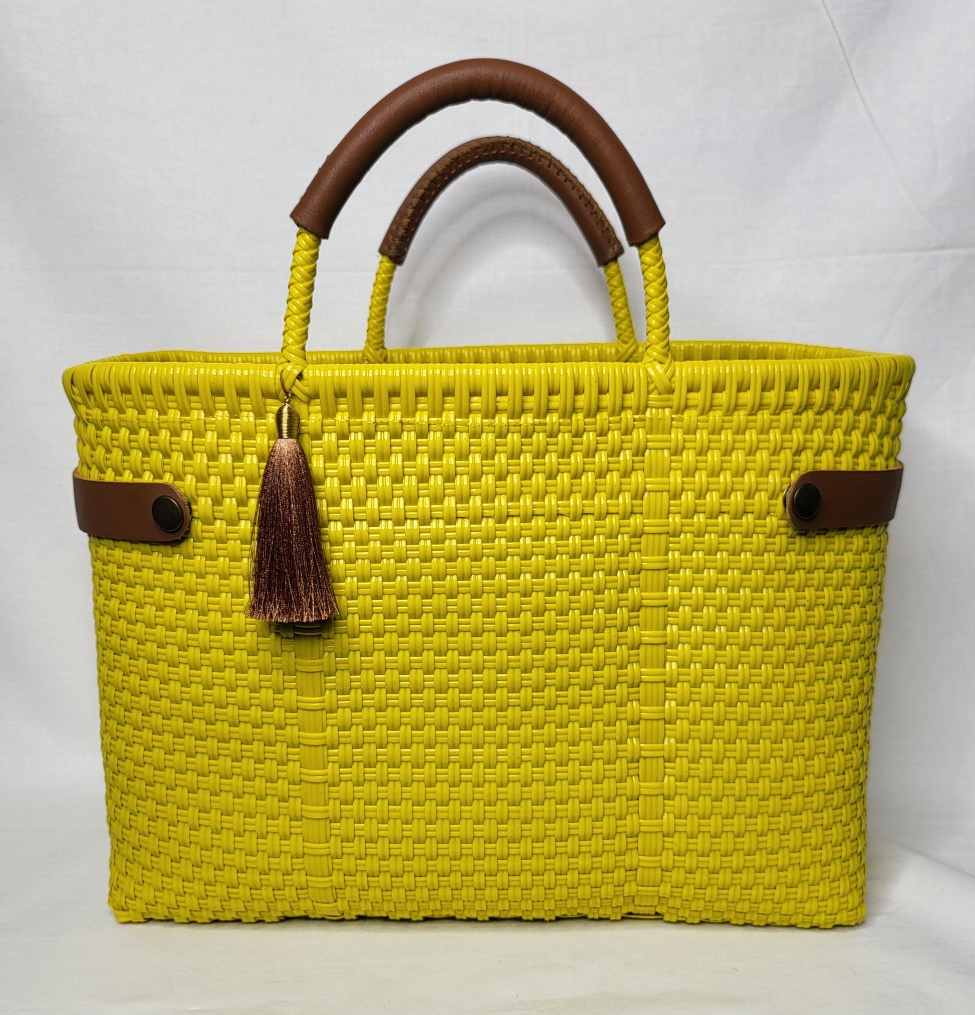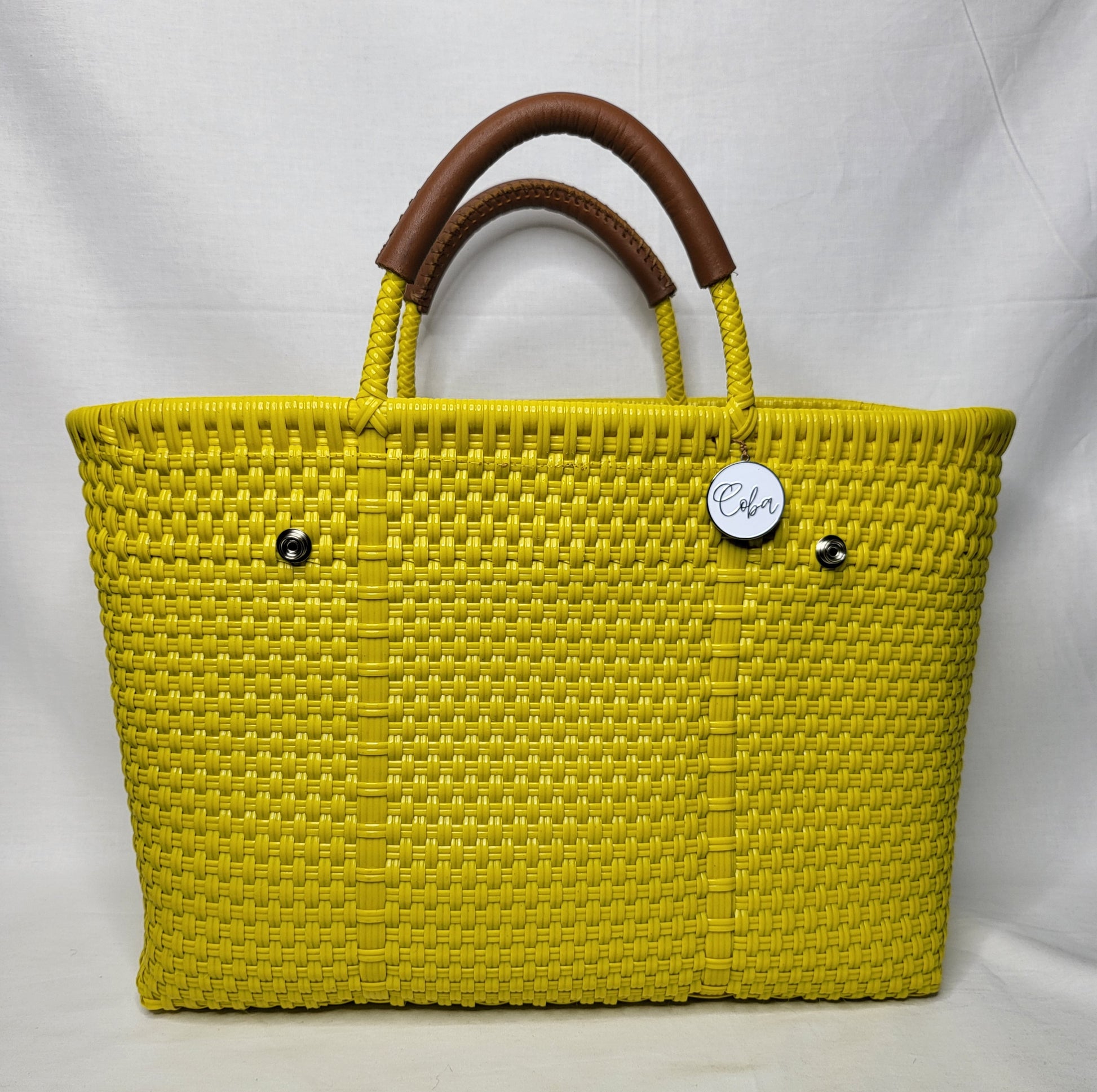Coba by DKH's bold colored bags are inspired by Mexican culture; its people, and its places. Each tote is assembled by hand by our skilled team of artisans using recycled plastics. No two bags are exactly alike, making each one a work of art!