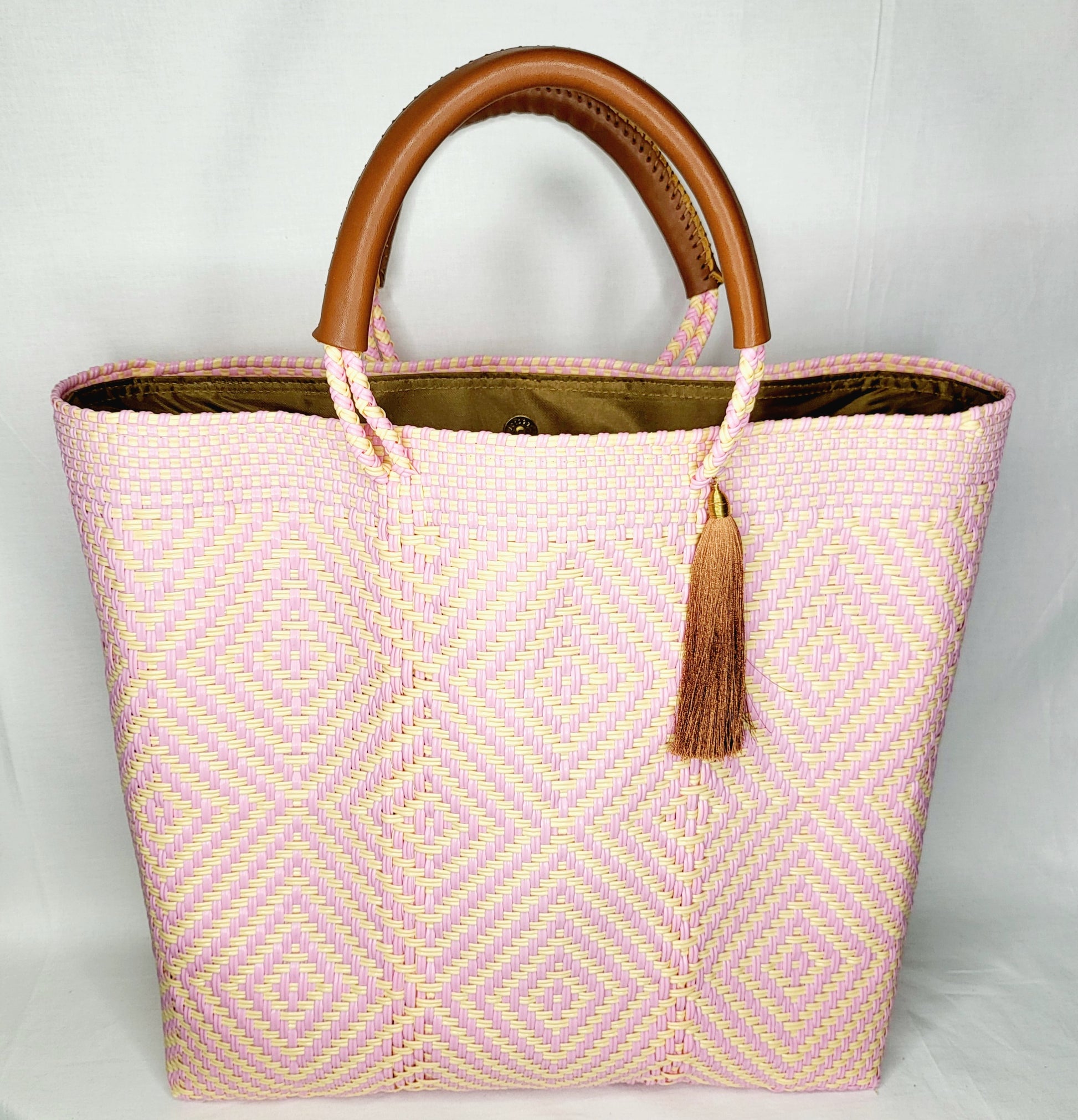 Coba by DKH's bold colored bags are inspired by Mexican culture; its people, and its places. Each tote is assembled by hand by our skilled team of artisans using recycled plastics. No two bags are exactly alike, making each one a work of art!