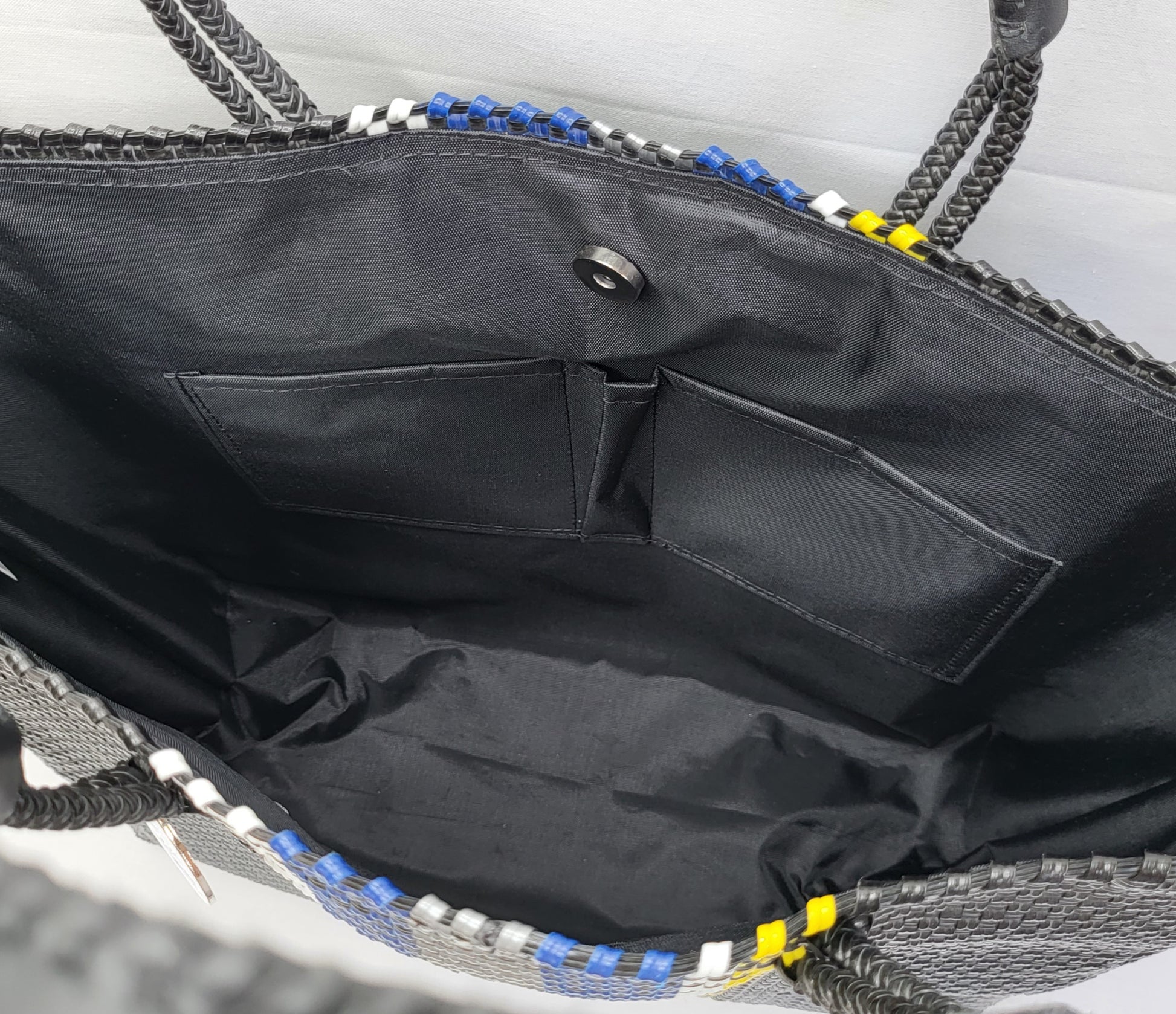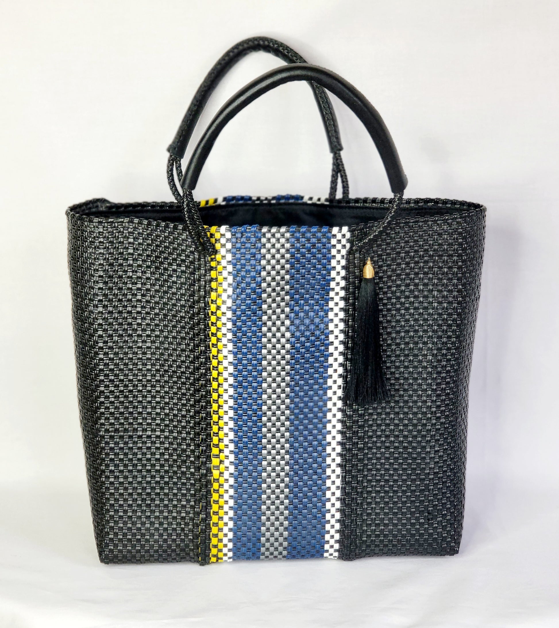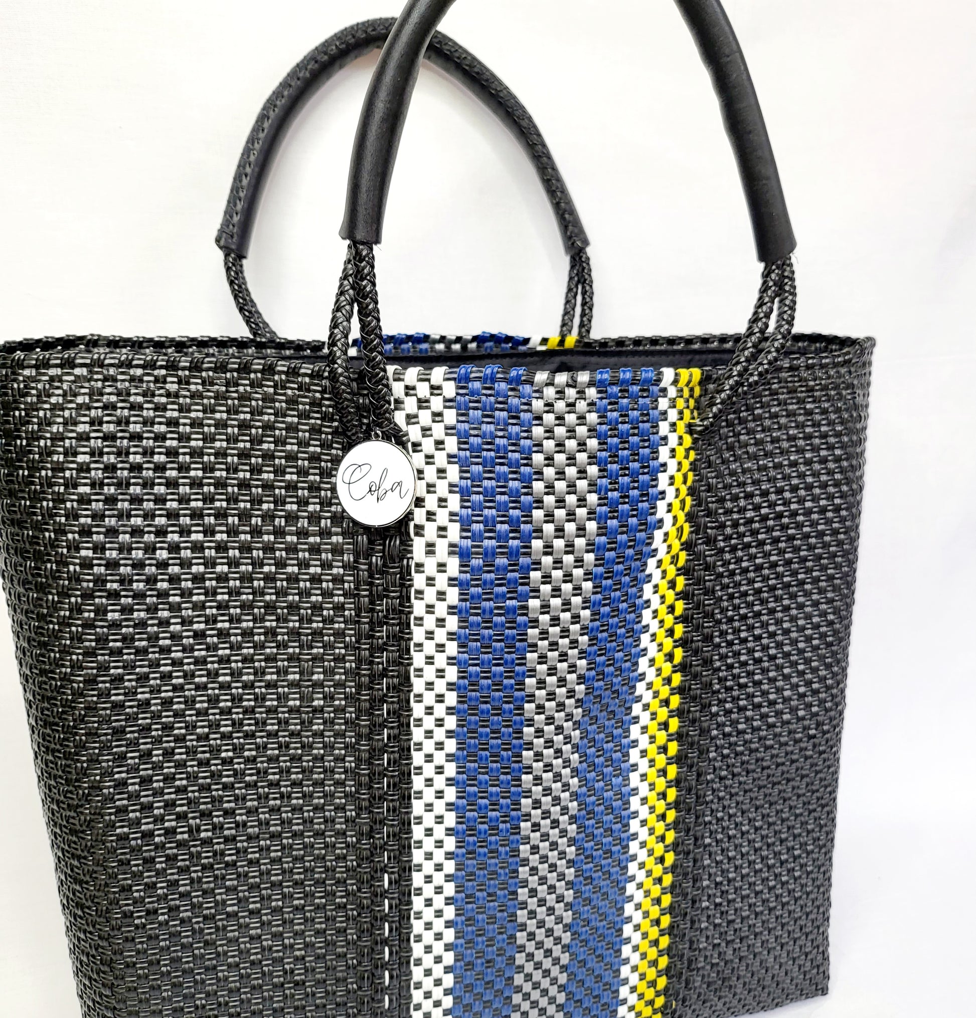 Coba by DKH's bold colored bags are inspired by Mexican culture; its people, and its places. Each tote is assembled by hand by our skilled team of artisans using recycled plastics. No two bags are exactly alike, making each one a work of art!